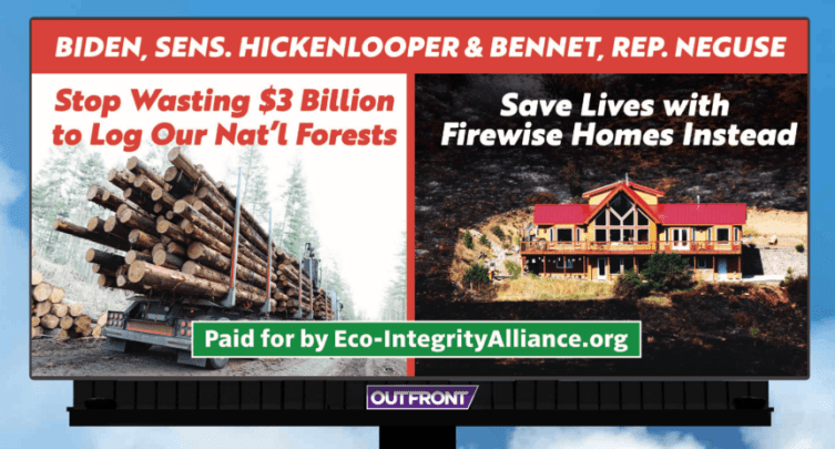 Eco-Integrity Alliance has erected a billboard on E. Colfax Ave. & Quebec St. in Denver, demanding that these elected officials “Stop Wasting $3 Billion to Log Our National Forests – Save Lives With Firewise Homes Instead,” displaying images of logging next to a home protected from wildfire.