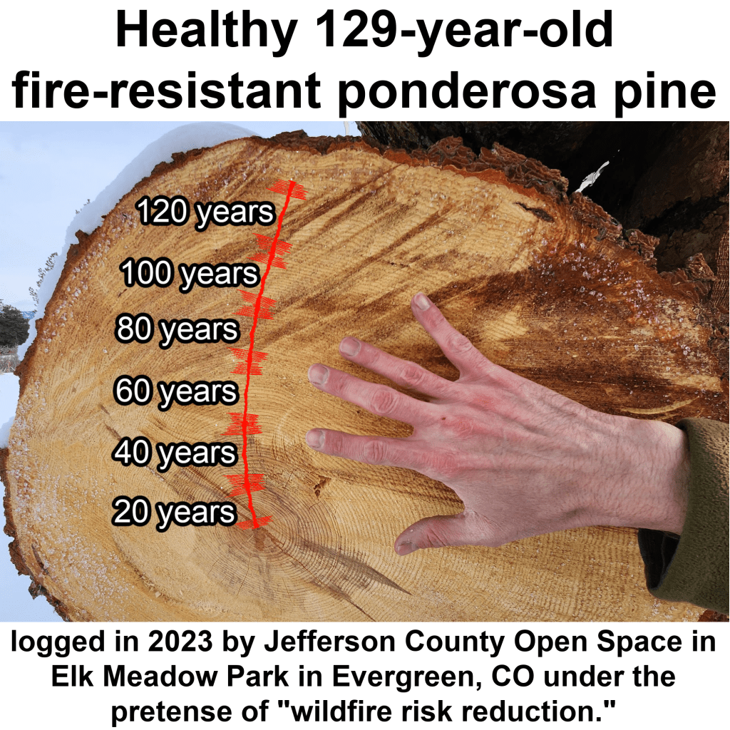 Right now Jefferson County Open Space is cutting hundreds of fire-resistant mature and old growth trees up to 129 years of age and 2.5 feet in diameter at Elk Meadow Park in Evergreen off Route 74, under the phony guise of “wildfire risk reduction.”