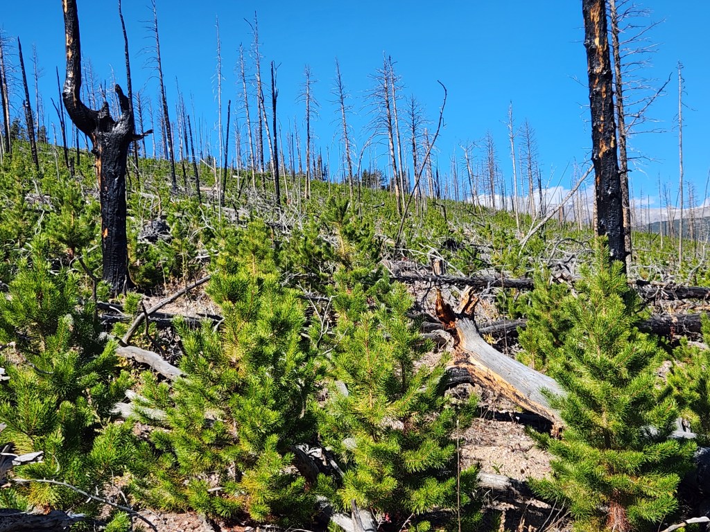 Videos and photos taken in October within the Cold Springs Fire area in the Boulder Ranger District of Roosevelt National Forest show a sparsely treed landscape with blackened stumps directly behind a U.S. Forest Service sign, which, despite Forest Service replanting in 2018, has still not recovered. Meanwhile, the adjacent unlogged forest on private land, remains lush, green, and completely intact.