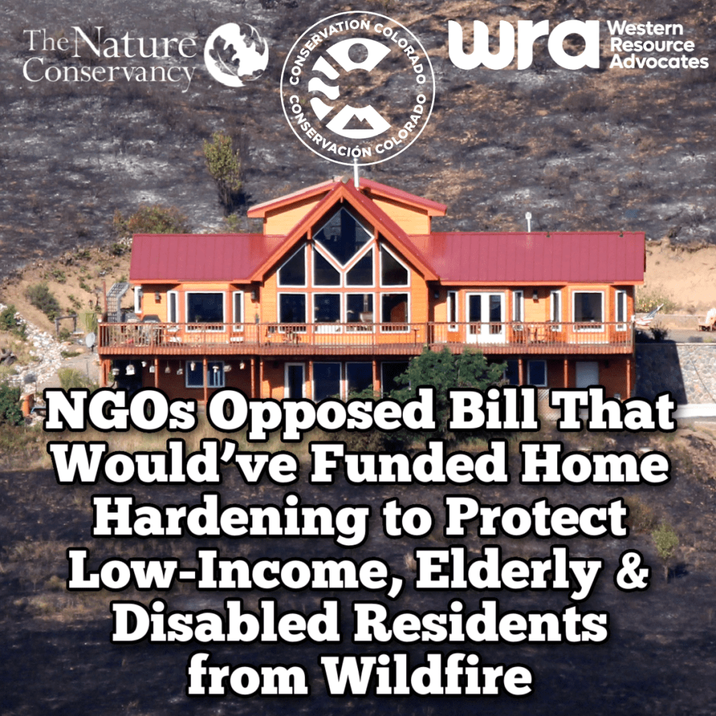 Leadership from “working lands” organizations Conservation Colorado, Western Resource Advocates, and The Nature Conservancy testified alongside industry and government logging interests to help axe a statehouse bill that would’ve routed a small portion of the state’s “wildfire mitigation” funding towards proven home hardening protections through grants to low-income residents, along with seniors and those with disabilities.