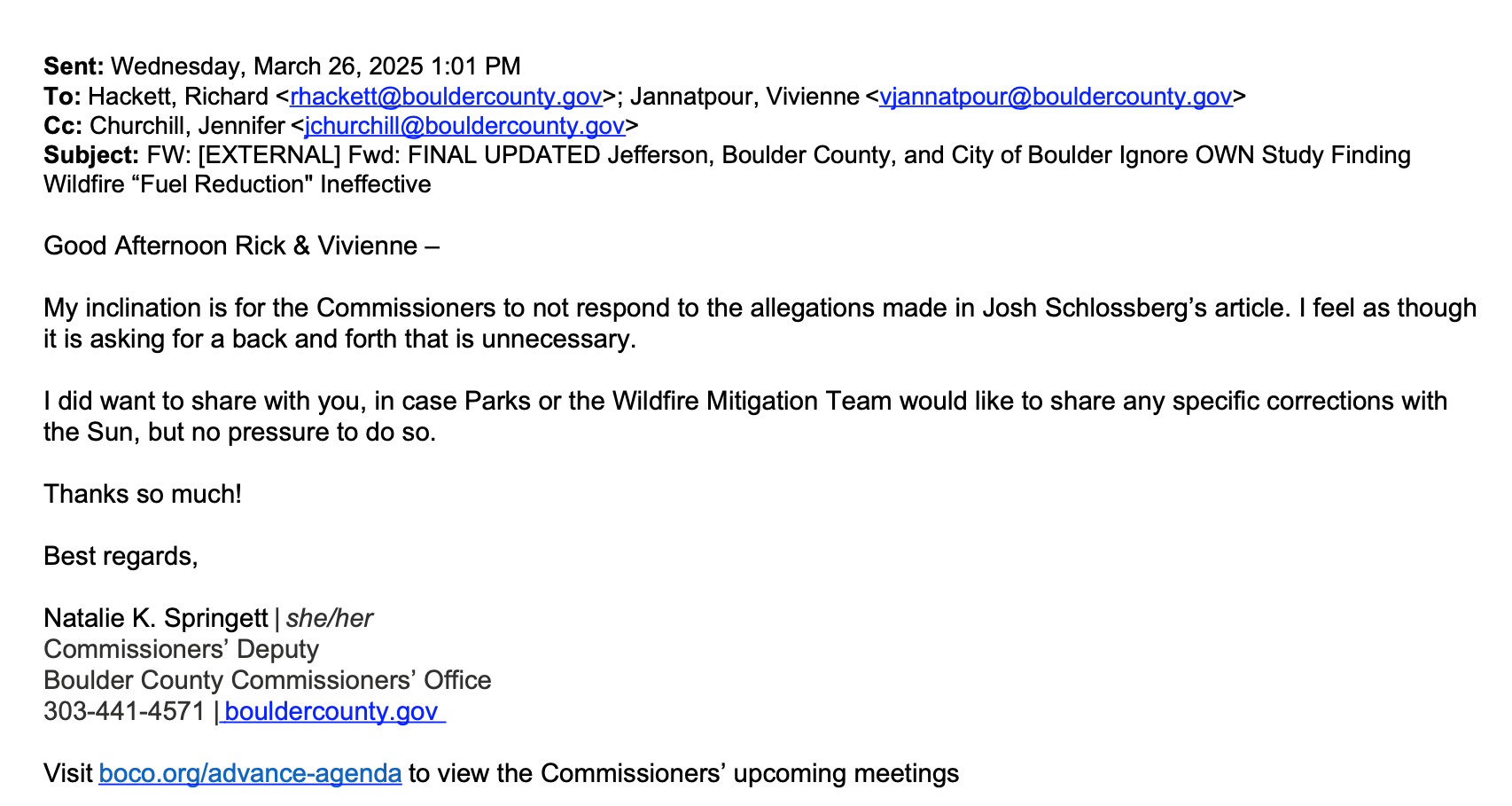 Falsehood: During Boulder County’s presentation, “Forest Resiliency in a Changing Climate,” the Senior Sustainability Strategist for Boulder County’s Office of Sustainability, Climate Action, and Resilience claimed the County was interested in “conversation” and “dialogue” with the public despite years of our local government either dodging or stonewalling conservationists. Indeed, internal emails recently received from a Colorado Open Records Act (CORA) request show an orchestrated county-wide refusal to address critiques from the public or questions from media on this issue (Boulder County’s Office of Sustainability, Climate Action, and Resilience did meet with me on October 1 to discuss concerns, but claimed the logging of Open Space was out of their jurisdiction and ignored all follow-up communications).