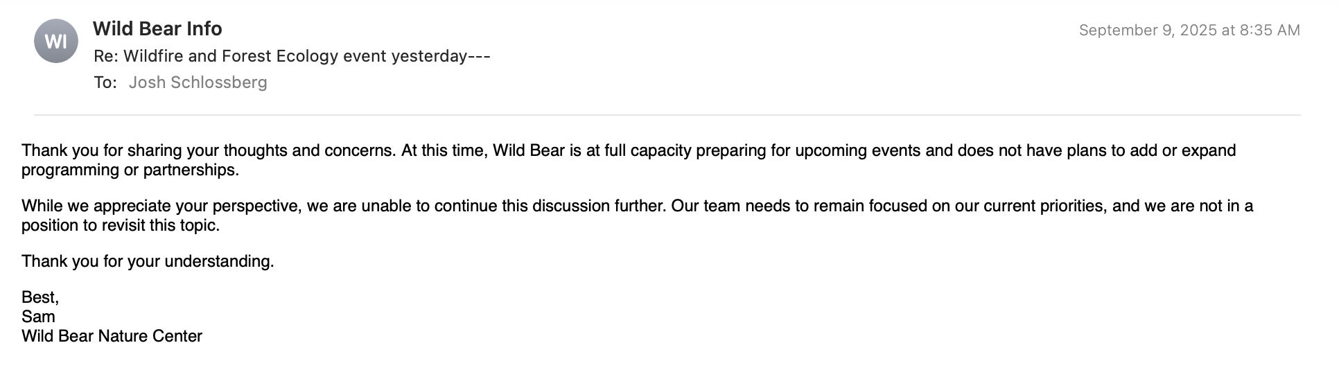 A final email to Wild Bear after the September event asking them to please consider a follow-up event featuring fire ecologists got only this response on September 9: “While we appreciate your perspective, we are unable to continue this discussion further. Our team needs to remain focused on our current priorities, and we are not in a position to revisit this topic.”